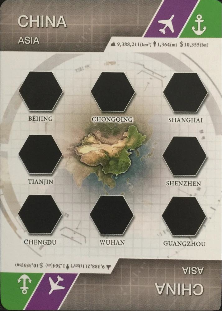 China Country Card featuring the cities of Beijing, Shanghai, Guangzhou, Shenzhen, Tianjin, Chongqing, Chengdu and Wuhan